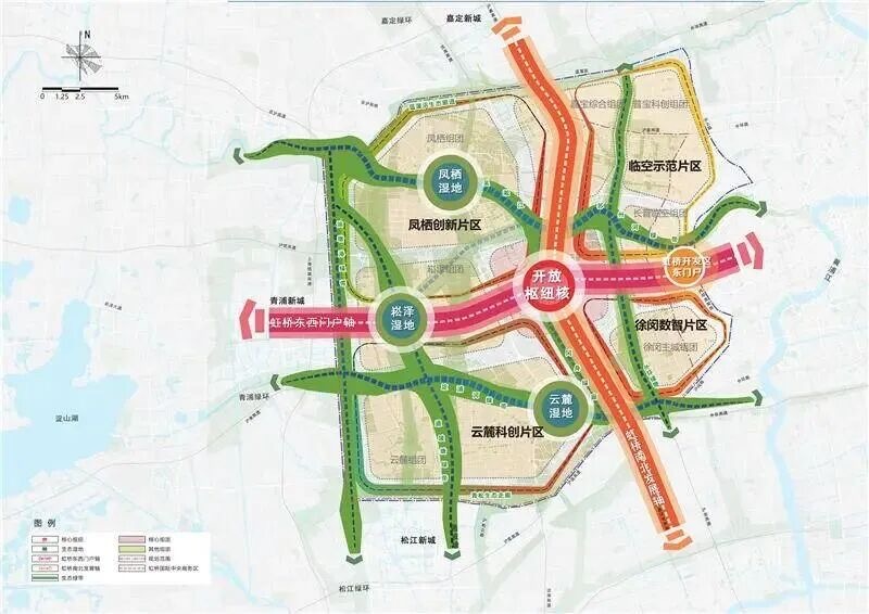 大虹桥地区规划形成“一核两轴四片、五带三湿八组团”的整体格局。其中,“一核”是聚焦虹桥商务区核心区,打造国际级资源要素配置枢纽;“两轴”是依托延安路-崧泽大道和嘉闵高架,分别形成东西门户轴和南北发展轴;“四片”是在轴线两侧构建凤栖创新片区、云麓科创片区、临空示范片区、徐闵数智片区等四个功能片区,打造国际化城区和高品质产业集聚区。“五带”是依托吴淞江、淀浦河、油墩港、通波塘和外环绿带,塑造五条结构性生态绿带;“三湿”是沿生态绿带,营造凤栖、崧泽、云麓三片体现江南水乡特色的湿地空间;“八组团”是围绕核心区重点产业功能、重要湿地等特色节点,形成功能差异化发展的八个组团,实现空间品质和资源要素的全面提升。