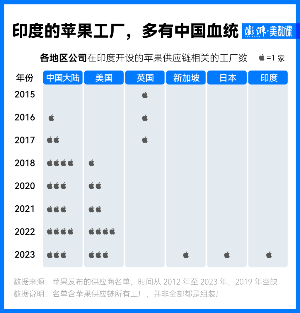 甚至在中国以外的地区,中国公司也在影响着“果链”里的公司。有媒体分析了 2012 年至 2022 年的苹果供应链后发现,东南亚和印度的苹果工厂激增是由中国公司涌向这些地区设厂推动的。