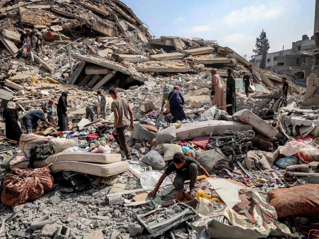 当地时间2025年9月15日,人们在加沙城查看遭以军袭击后的废墟。新华社 图