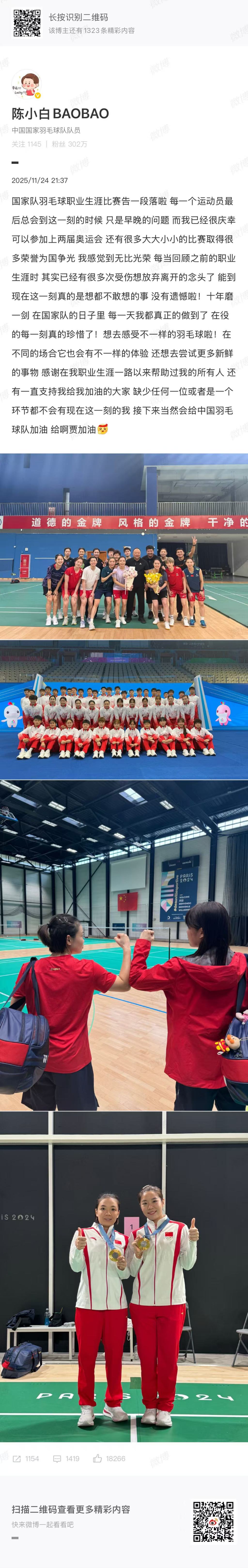 她写道,“每当回顾之前的职业生涯时,其实已经有很多次受伤想放弃离开的念头了,能到现在这一刻真的是想都不敢想的事。没有遗憾啦!十年磨一剑,在国家队的日子里,每一天我都真正的做到了,在役的每一刻真的珍惜了!想去感受不一样的羽毛球啦!在不同的场合它也会有不一样的体验,还想去尝试更多新鲜的事物。”
