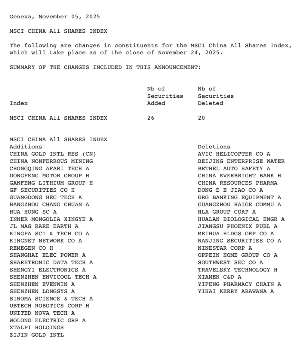 MSCI指数最新调整:26只中国股票获纳入,涉资源、半导体等多领域