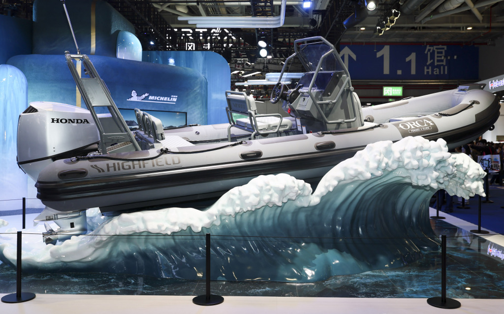 2025年11月8日,在第八届进博会汽车及智慧出行展区米其林展位拍摄的使用复合涂层材料的刚性充气艇。新华社记者 王翔 摄