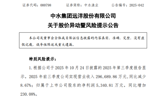 对于近期股价异动,中水渔业提示,根据公司于2025年10月24日披露的2025年第三季度报告显示,2025年前三季度公司实现营业收入29.67亿元,同比减少8.67%;归母净利润5340.81万元,同比增加230.08%。
