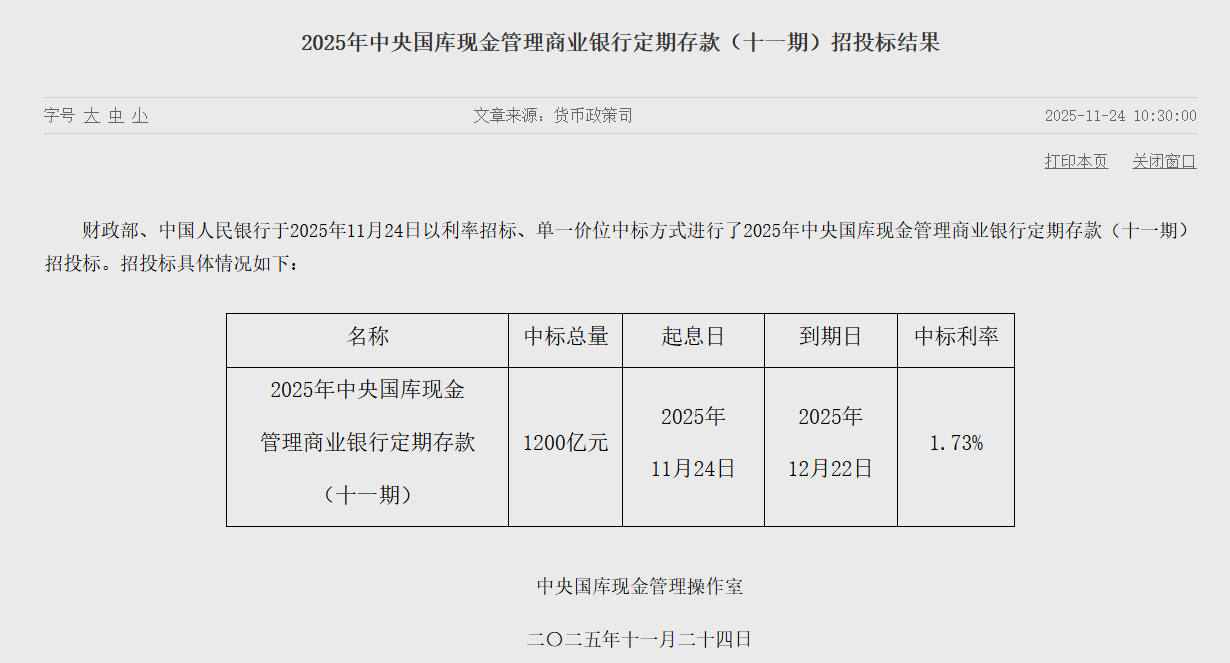正文 财政部、央行1个月期国库现金定存中标利率1.73% 海信证券 V管理员 /2025-11-24 11:10:04/1阅读/0评论 1124 财政部、中国人民银行于2025年11月24日以利率招标、单一价位中标方式进行了2025年中央国库现金管理商业银行定期存款(十一期)招投标。