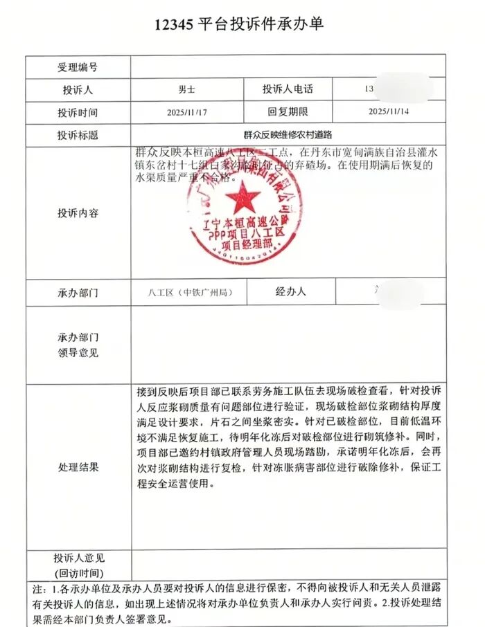 据王先生发布的12345平台投诉件承办单显示,11月17日,王先生将上述问题投诉至12345平台,八工区(中铁广州工程局)对此作出回应:“接到反映后项目部已联系劳务施工队伍去现场破检查看,针对投诉人反映浆砌质量有问题部位进行验证,现场破检部位浆砌结构厚度满足设计要求,片石之间坐浆密实。针对已破检部位,目前低温环境不满足恢复施工,待明年化冻后对破检部位进行砌筑修补。同时,项目部已邀约村镇政府管理人员现场踏勘,承诺明年化冻后,会再次对浆砌结构进行复检,针对冻胀病害部位进行破除修补,保证工程安全运营使用。”